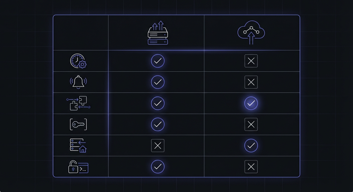 Reliability responsibility: When your self-hosted monitoring goes down, who monitors the monitor? You need to build your own redundancy.
