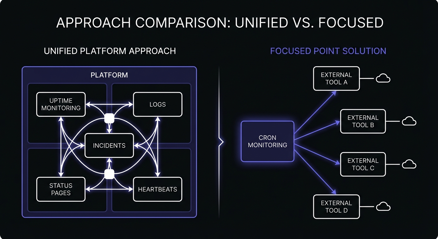 Cron Crew focuses specifically on cron job monitoring. Rather than building a platform, Cron Crew does one thing well.