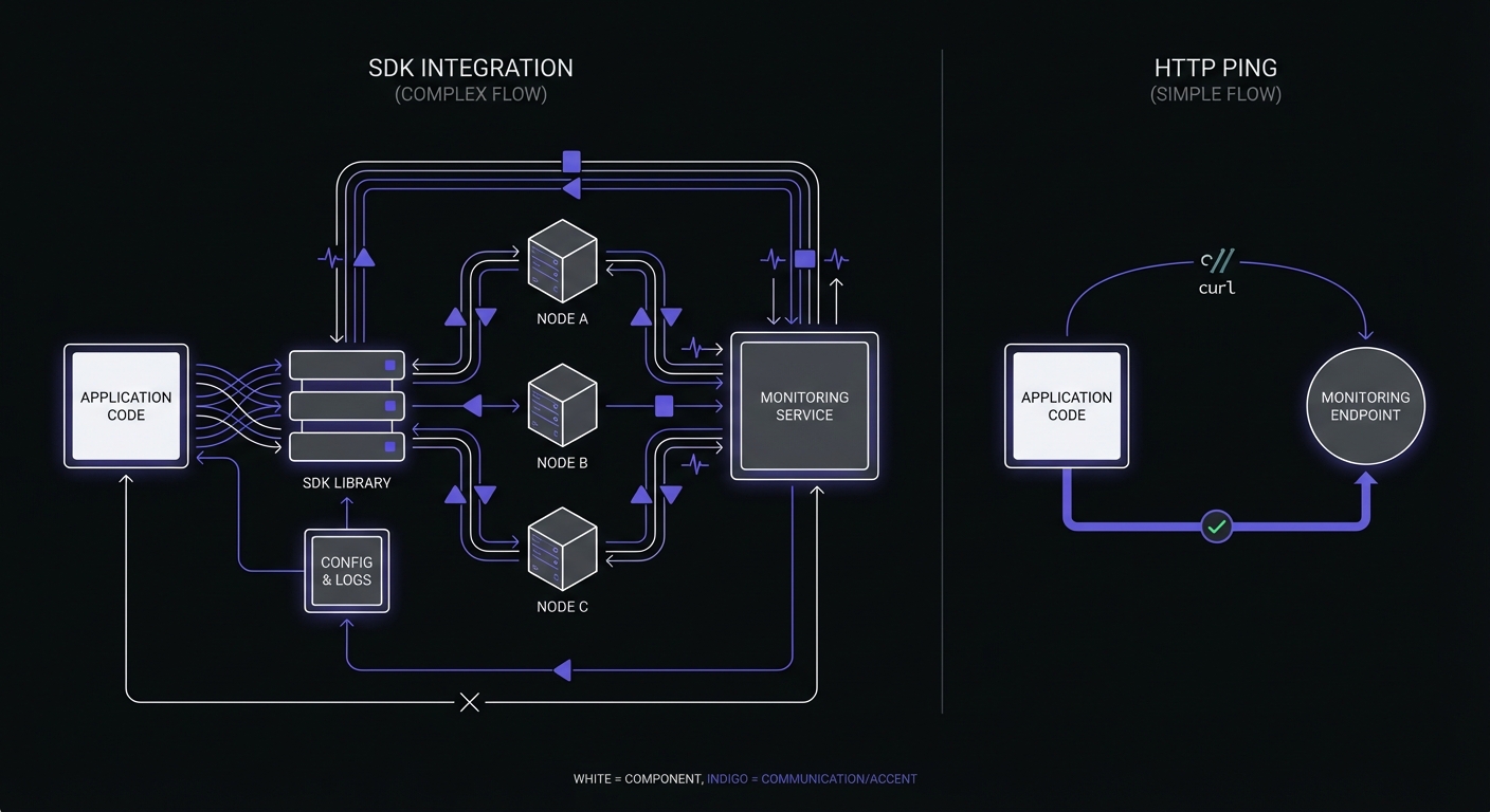 You want SDK-free monitoring: Adding SDK dependencies to your application has costs. Simple HTTP pings have zero application impact.