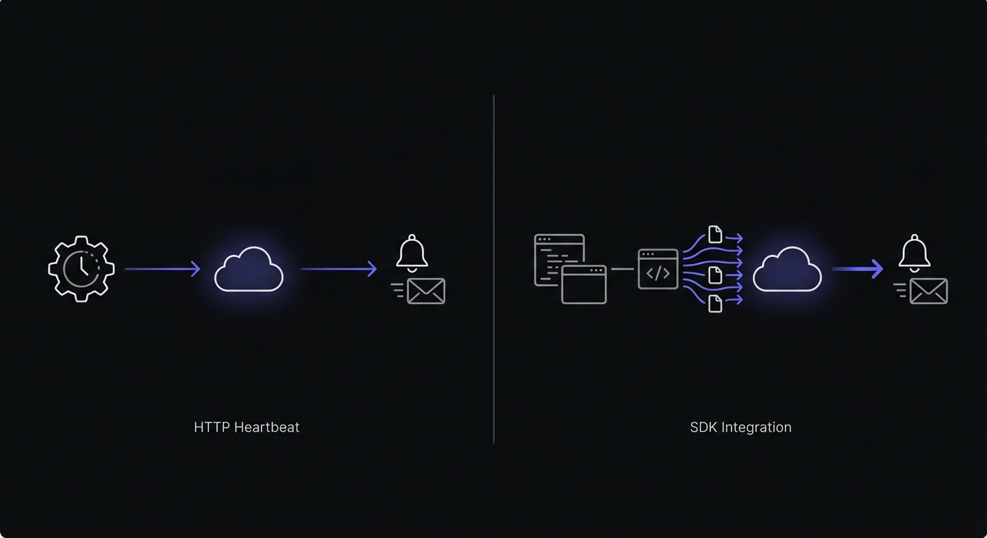 For most small teams, HTTP heartbeat monitoring provides everything needed. SDK integration makes sense when you want tight error correlation or already use a platform like Sentry.