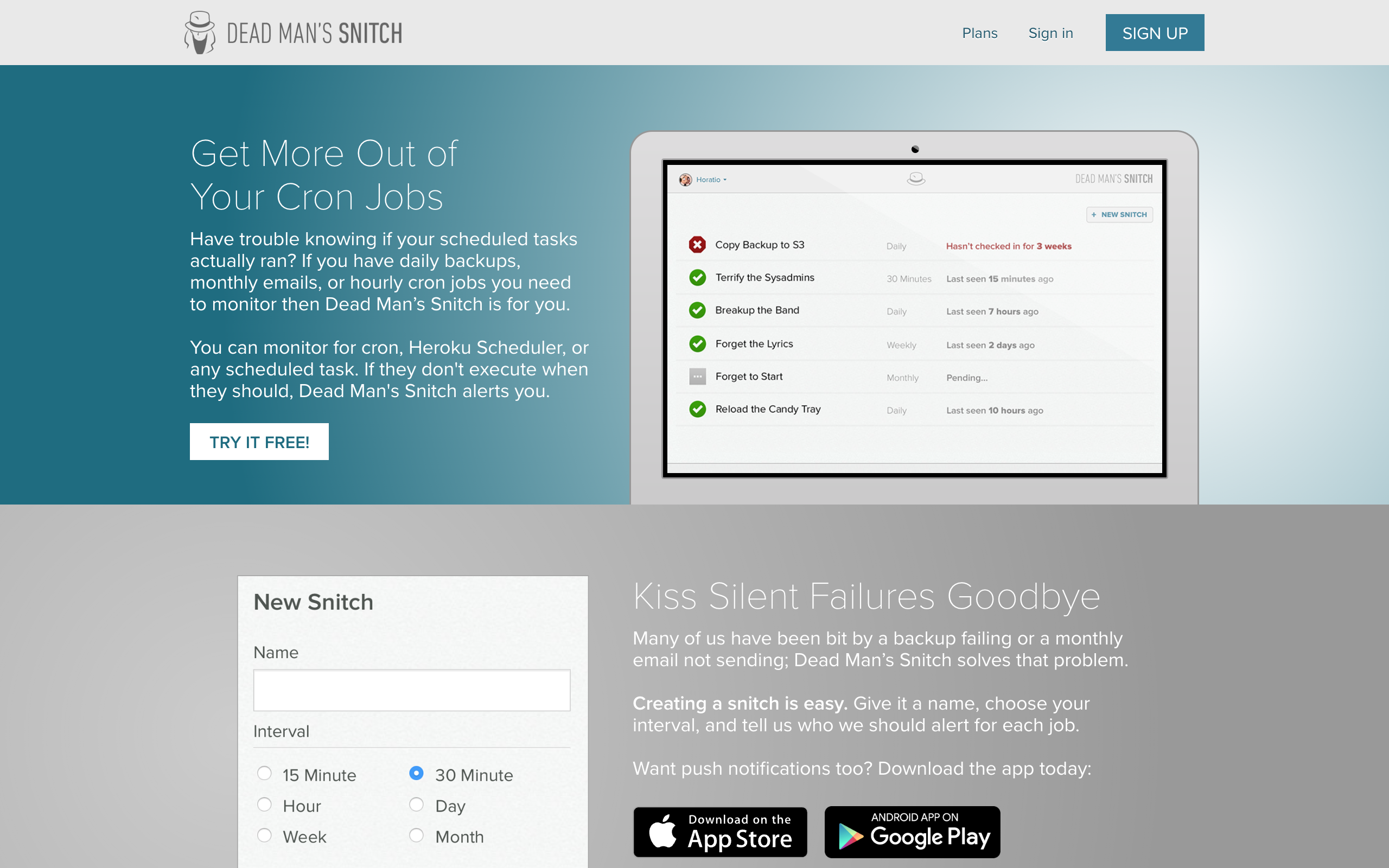 Dead Man's Snitch is one of the original cron monitoring services, known for its memorable name and simple approach.